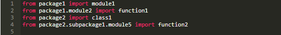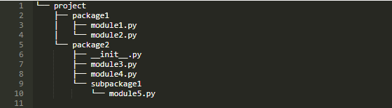 package2目录有三个文件:两个模块:module3.py和module4.py,以及初始化文件__init__.py。它还包含一个目录subpackage1,subpackage1又包含一个文件module5.py。