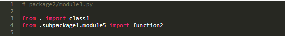 在第一个导入语句中,一个点表示你正在从当前包导入class1。别忘了,导入一个包基本上是导入包的__init__.py文件作为模块。在第二个导入语句中,你将再次使用一个点,因为subpackage1 与当前模块module3.py位于同一个目录中。