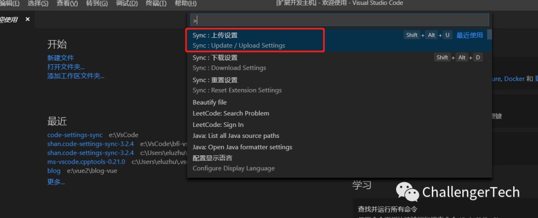 快捷键ctrl+shit+p出现一个输入框,输入sync,点击其中的上传设置。