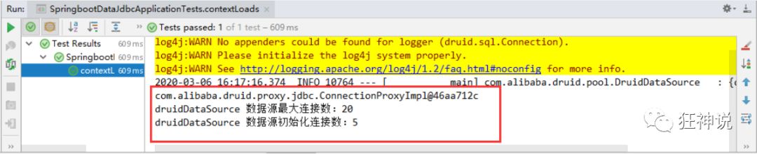 class SpringbootDataJdbcApplicationTests {//DI注入数据源DataSource dataSource;public void contextLoads() throws SQLException {//看一下默认数据源System.out.println(dataSource.getClass());//获得连接Connection connection = dataSource.getConnection();System.out.println(connection);DruidDataSource druidDataSource = (DruidDataSource) dataSource;System.out.println("druidDataSource 数据源最大连接数:" + druidDataSource.getMaxActive());System.out.println("druidDataSource 数据源初始化连接数:" + druidDataSource.getInitialSize());//关闭连接connection.close();}}