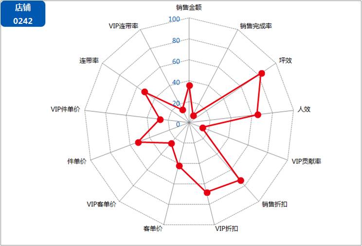 排行榜分析法还可以继续深化,让它更业务化,这也是我的月分析模板里面的一张图(每个值代表该店铺在100家店铺里面的排名)。一张图就可以了解这个店铺的短板和优势,一目了然,简单并实用。谁也不能否认这不是排行榜分析法。