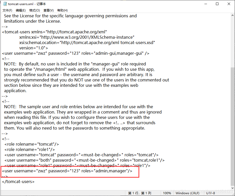 前面的 <must-be-changed> 代表密码未设置,我们添加的用户 zwz 就是管理员。admin,manager都是管理员的含义,可能它保留着老版本的设置吧。