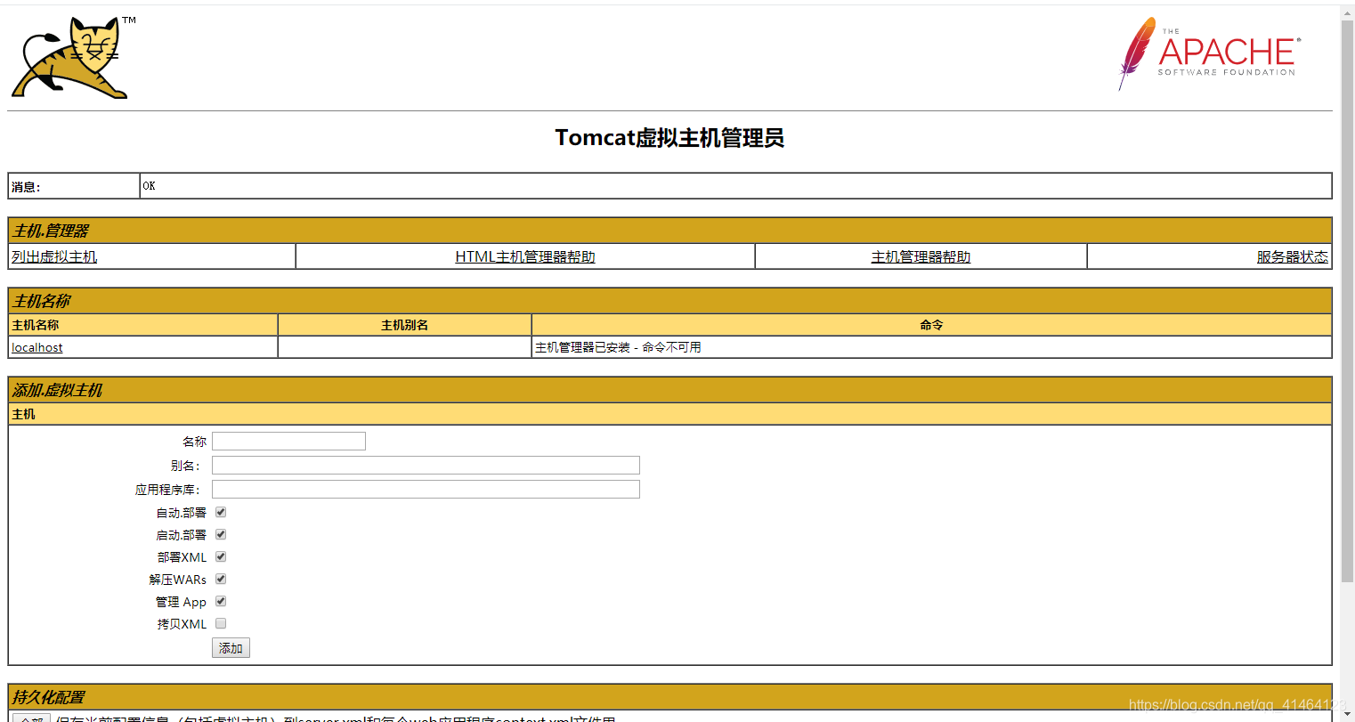 输入http://localhost:8080/host-manager,浏览器会跳转到 Tomcat虚拟主机管理员 界面