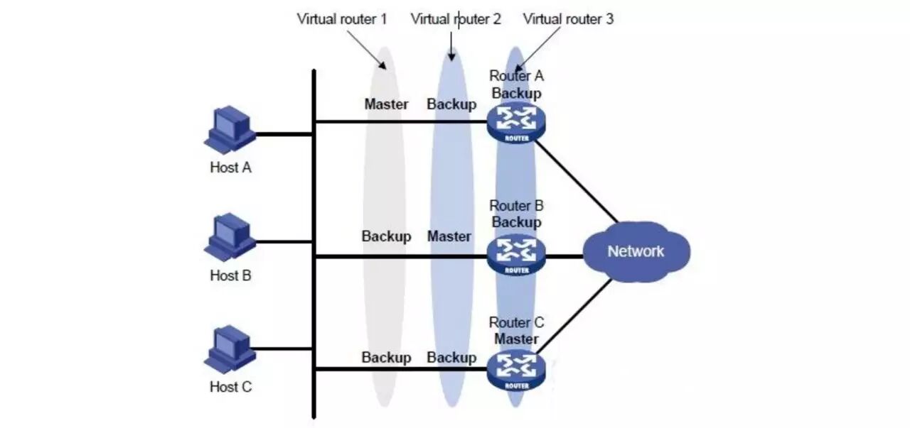 为了实现业务流量在Router A、Router B和Router C之间进行负载分担,需要将局域网内的主机的缺省网关分别设置为虚拟路由器1、2和3。在配置优先级时,需要确保三个备份组中各路由器的VRRP优先级形成交叉对应。为了便于理解,我们假定有三个路由设备Router A、B、C和三台主机Host A、B、C,列举有在不同的虚拟路由组中。对路由器A来说,因在虚拟路由组1中Router A的优先级高于另外两个,因此,Router A 作为 Master 路由器,Router B 和Router C 作为 Backup路由器;同样,对路由器B来说,因在虚拟路由器组2中Router B的优先级高于另外两个,因此,Router B 作为 Master 路由器,Router A 和Router C 作为 Backup路由器;对路由器C来说,因在虚拟路由器组3中Router C的优先级高于另外两个,因此,Router C 作为 Master 路由器,Router A 和Router B 作为 Backup路由器。对不同的主机来说,一旦其master路由器出故障后,会在另外正常的路由器中根据优先级重新选定master路由。如这里假定Host A的默认网关指向Router A,即Host A指向虚拟路由器组1的默认网关,对主机A来说,如果其master路由出现故障,即Router A出现故障,则会从另外两个正常的备份虚拟路由中根据各自的优先级选取高优先级的作为新的master路由,这里就是选取Router B作为其master路由来完成网关功能。假如想了解更多关于VRRP协议相关的信息请查阅相关资料,这里不再过多介绍。