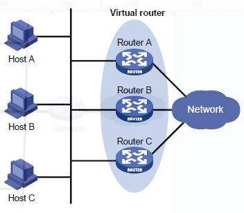 在上图中,Router A、Router B和Router C组成一个虚拟路由器。各虚拟路由器都有自己的IP地址。局域网内的主机将虚拟路由器设置为缺省网关。Router A、Router B和Router C中优先级最高的路由器作为Master路由器,承担网关的功能。其余两台路由器作为Backup路由器。当master路由器出故障后,backup路由器会根据优先级重新选举新的master路由器承担网关功能。Master 路由器周期性地发送VRRP 报文,在虚拟路由器中公布其配置信息(优先级等)和工作状况。Backup路由器通过接收到VRRP 报文的情况来判断Master 路由器是否工作正常。