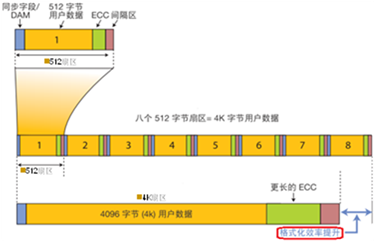 格式化开销降低10%~15%,可用较少的物理空间存储相同的用户数据量,有利于厂家制造出容量更大的硬盘。