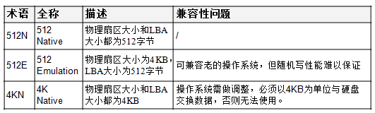 512E是过渡方案,厂家期望尽快把物理扇区和LBA都统一到4KB,即4KN硬盘。针对4KN盘,操作系统必须做调整适配,访问硬盘时以4KB/LBA收发数据。