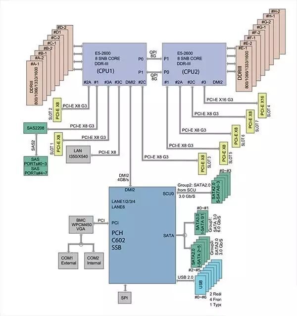为了解决这些瓶颈,就出现了NUMA(Non-Uniform Memory Architecture)架构,如下图所示,每个CPU都有自己的内存(将北桥功能集成到了CPU),每个CPU也有直接管理的PCI-E插槽,低速设备比如SATA/SAS,USB等被PCH, Platform Controller Hub(替换了南桥)管理。
