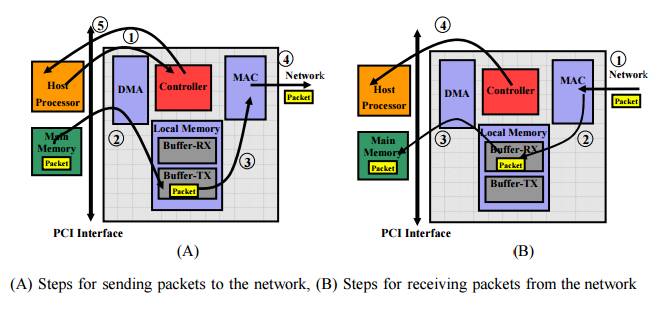 首先看一下网卡的功能,网卡实现数据包的发送和接受,上图A是网卡发送数据包的流程,图B是网卡接收数据包的流程。