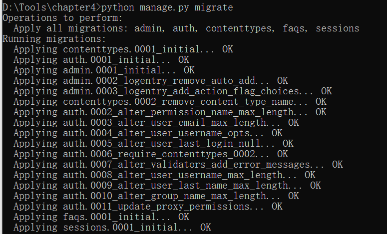 执行命令: python manage.py migrate ,如下就是迁移成功了。