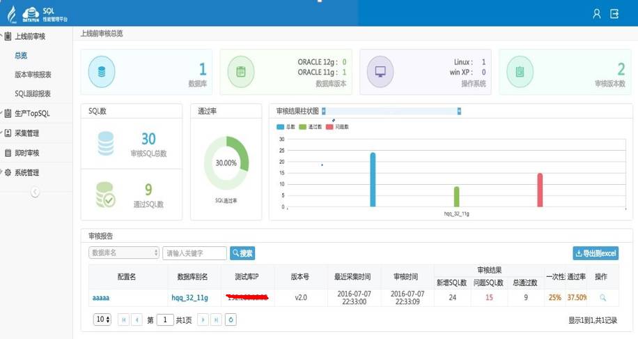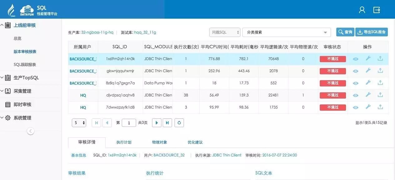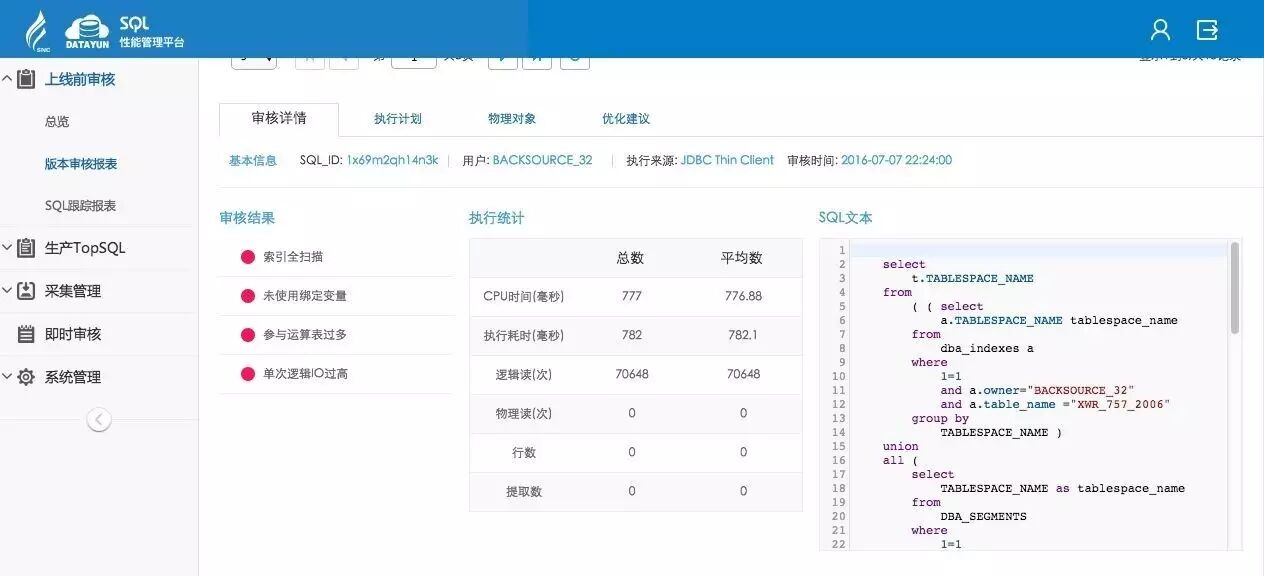 SQL性能管理平台实现了SQL性能的360度全生命周期管控,并且通过各种智能化提示和处理,将绝大多数本来因SQL引发的性能问题,解决在问题发生之前,提高系统稳定度。