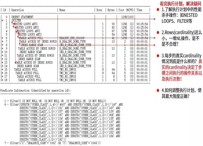 各种操作之间的关系是由cardinality等各种因素触发的,不正确的cardinality会导致本来应该走HASH JOIN的走了Nested loops Join。往往入口处就有问题,导致后续执行计划全部错误,所以明确各种步骤的关系,有助于找出影响问题的根源步骤。