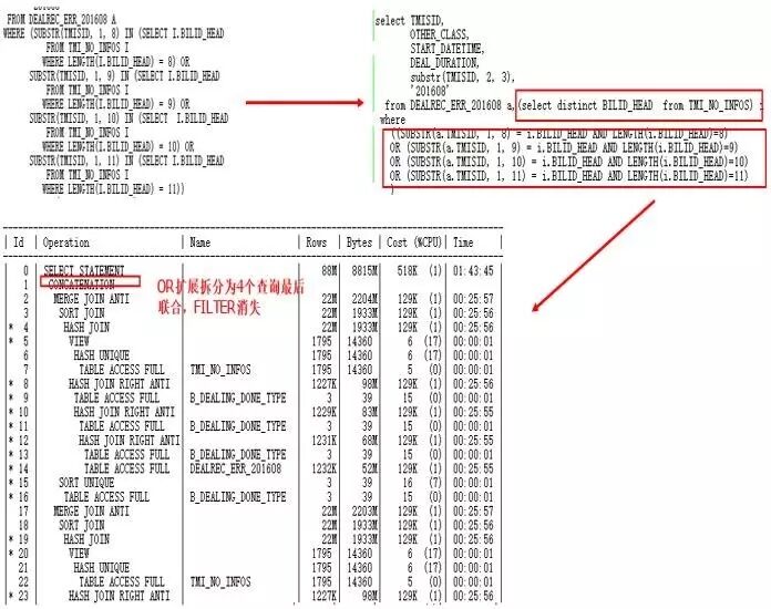 HASH JOIN是必须要等值连接的,侧重于大数据量运算,本次分享的巨慢SQL就是通过将OR子查询通过SUBSTR函数构造等值连接,实现HASH JOIN运算,侧重于内存消耗。