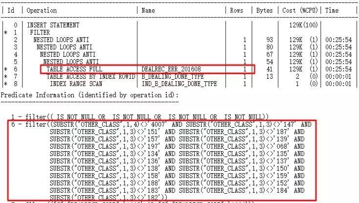 这条语句其实就是查询DEALREC_ERR_201608表,有各种复杂的子查询,初看此子查询,我基本已经了解问题大概出在什么地方了,先卖个关子,看执行计划先: