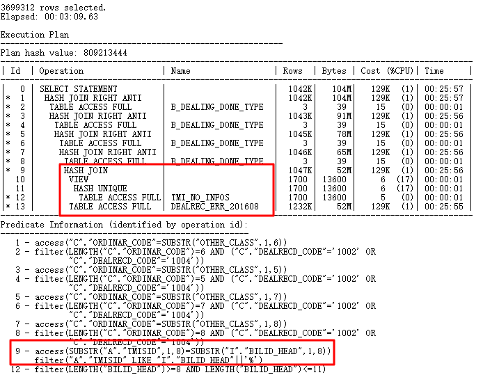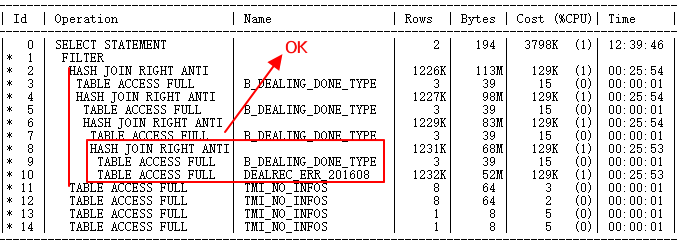 DEALREC_ERR_201608与B_DEALING_DONE_TYPE原来走NL的现在正确走HASH JOIN。Build table是小结果集,probe table是ERR表大结果集,正确。