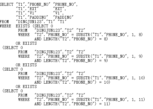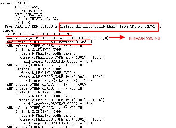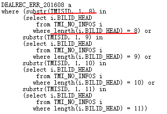 ERR表与TMI_NO_INFOS表关联,ERR.TMISID前8位与ITMI_NO_INFOS.BILLID_HEAD长度在8-11之间的前8位完全匹配,在此前提下,TMISID like BILLID_HEAD||’%’。