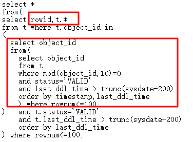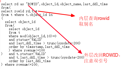 从10053中可以看出,查询转换失败,因为遇到了rowid,当然把Rowid改别名是可以,但是此SQL要求必须用Rowid名字。