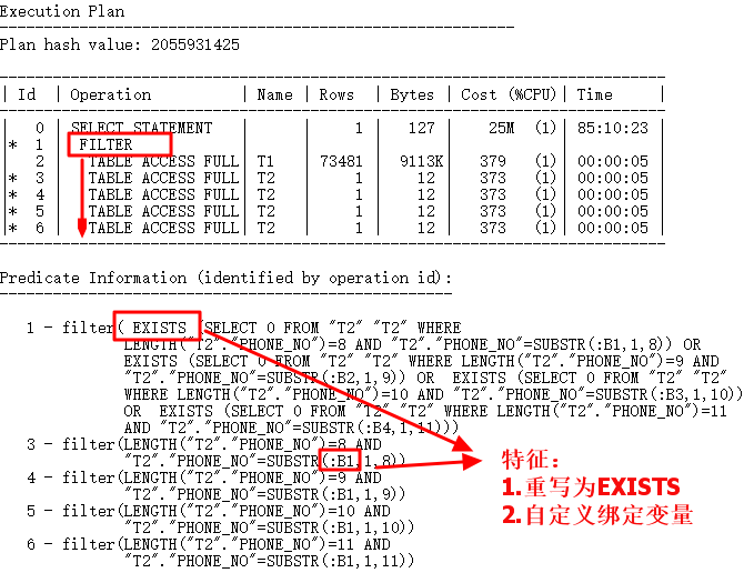 所以,以后看到有自动生成的绑定变量的执行计划,都是类似Filter的操作,比如标量子查询,UPDATE关联子查询,优化的话,都需要干掉(类)Filter来优化。