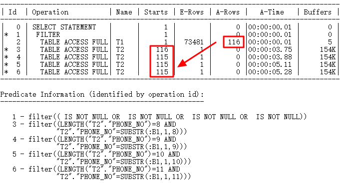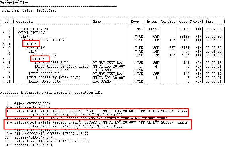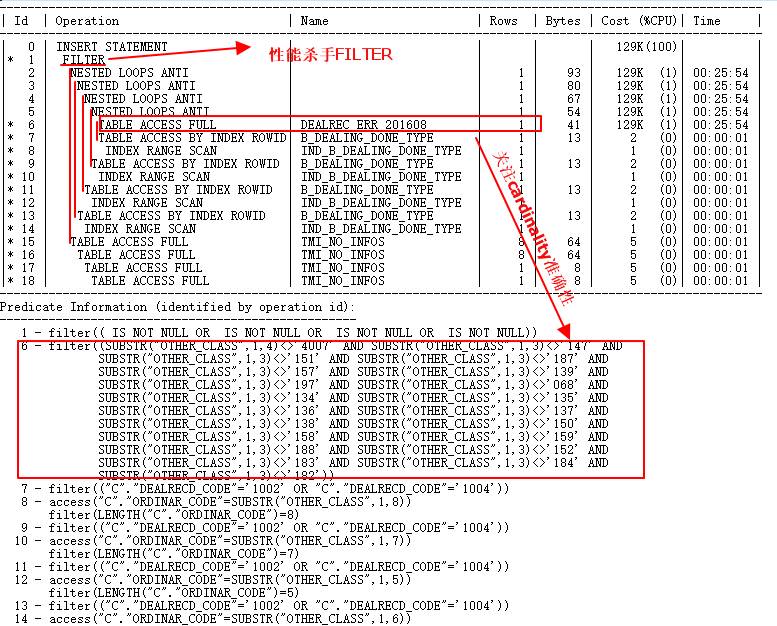 但是ID=2与ID=11到14,也就是与TMI_NO_INFOS的OR子查询,还是FILTER,驱动数千万次子节点查询,下一步优化要解决的问题。
