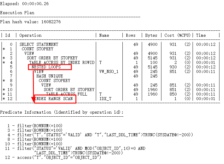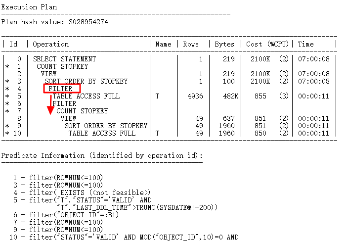 一条SQL执行12分钟没有结果:其中object_id有索引,从查询结构来看,内层查询完全可以独立执行(最多100行),然后与外层的表进行关联,走NL,这样可以利用到object_id索引,然而,事与愿违,ID=4出现Filter,这样内层查询会驱动N次,问题出在何处?