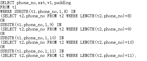 追本溯源,从SQL含义出发,上面含义是ERR表的TMISID截取前8,9,10,11位与TMI_NO_INFOS.BILLID_HEAD匹配,对应匹配BILLID_HEAD长度正好为8,9,10,11。很显然,语义上可以这样改写: