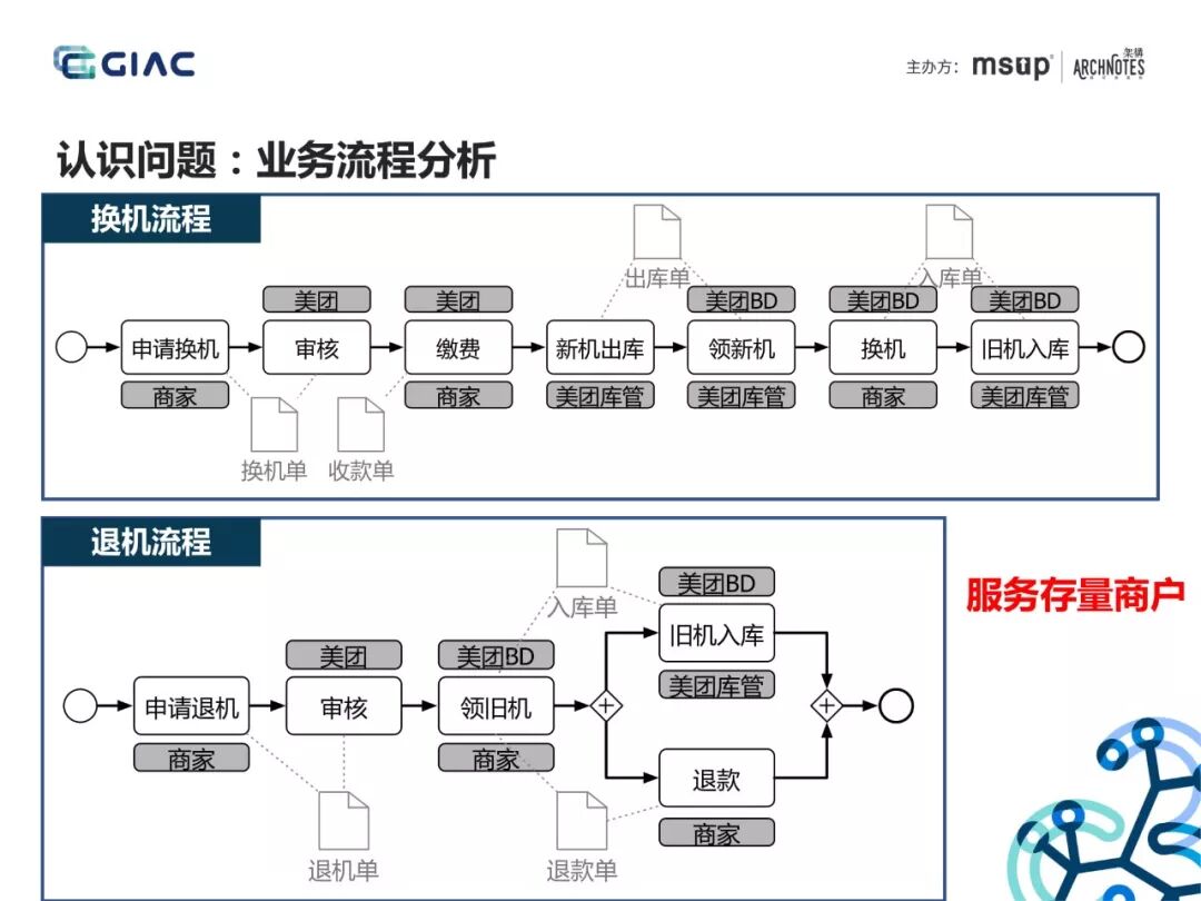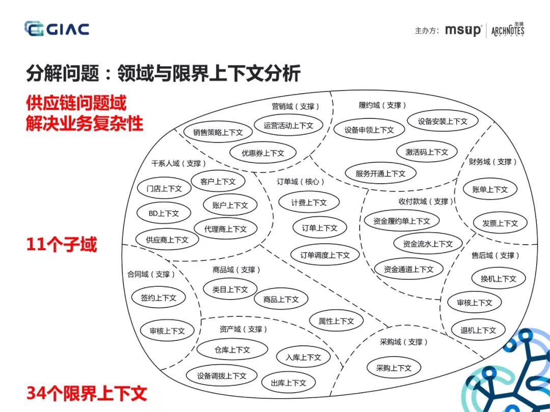 案例背景介绍:互联网进入下半场,美团发力B端,进行商家供给侧改革,收单收银是线下餐饮商家数字化和智能化改造的重点。供应链技术团队如何应对复杂业务场景,高效连接收单收银产品和B端商家,灵活应对业务快速变化发展。解决思路/成功要点:1. 业务发展驱动技术架构2. 识别问题域,划分领域和限界上下文3. 领域驱动+数据驱动4. 满足业务流程、业务场景,迭代演进成果:美团收单收银业务餐饮市场占有率第一,快速提高上单效率,灵活支持业务策略。