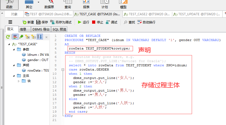CREATE OR REPLACE PROCEDURE "TEST_CASE" (idnum IN VARCHAR2 DEFAULT '1', gender OUT VARCHAR2) AS rowData TEST_STUDENT%rowtype; BEGIN select * into rowData from TEST_STUDENT where SNO=idnum; case rowData.GENDER when 1 then dbms_output.put_line('女人'); gender :='女人'; when 2 then dbms_output.put_line('男人'); gender :='男人'; else dbms_output.put_line('人妖'); gender :='人妖'; end case; END;