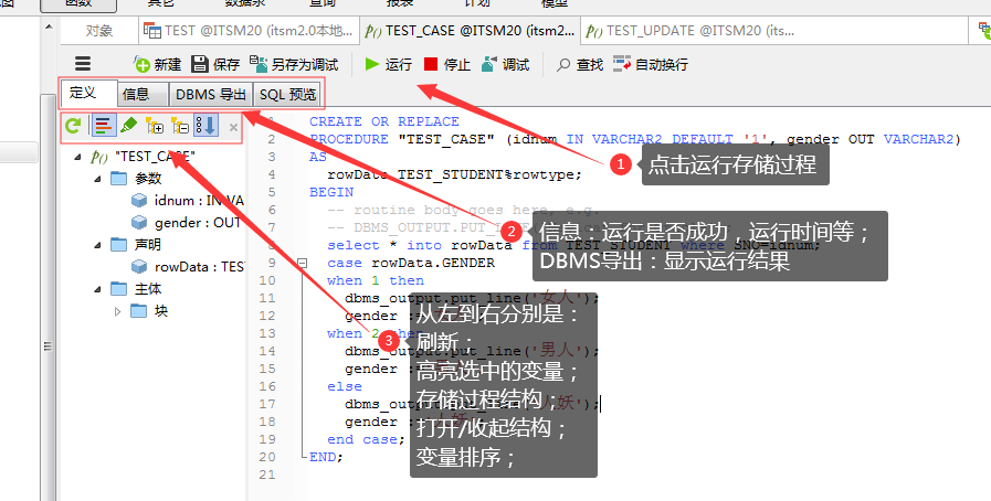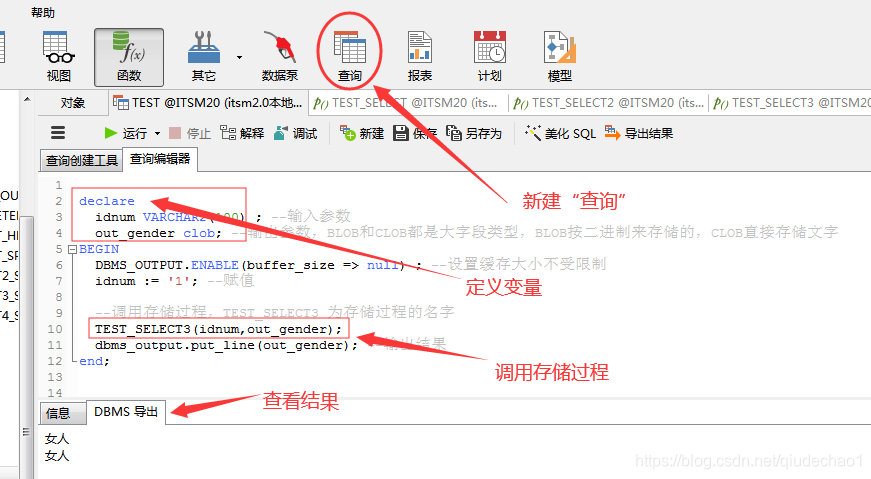 declare idnum VARCHAR2(100) ; --输入参数 out_gender clob; --输出参数,BLOB和CLOB都是大字段类型,BLOB按二进制来存储的,CLOB直接存储文字 BEGIN DBMS_OUTPUT.ENABLE(buffer_size => null) ; --设置缓存大小不受限制 idnum := '1'; --赋值 --调用存储过程,TEST_SELECT3 为存储过程的名字 TEST_SELECT3(idnum,out_gender); dbms_output.put_line(out_gender); --输出结果 end;