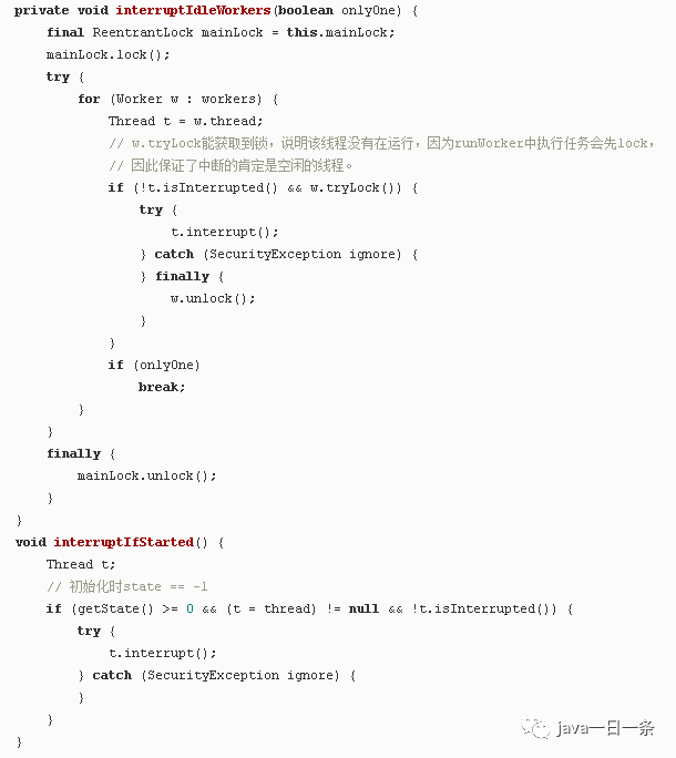 shutdown这个方法会将runState置为SHUTDOWN,会终止所有空闲的线程。shutdownNow方法将runState置为STOP。和shutdown方法的区别,这个方法会终止所有的线程。主要区别在于shutdown调用的是interruptIdleWorkers这个方法,而shutdownNow实际调用的是Worker类的interruptIfStarted方法: