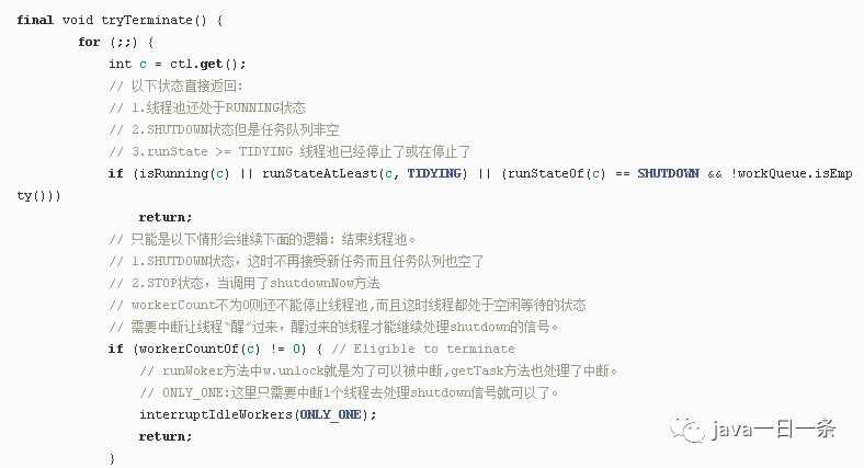 processWorkerExit方法中会尝试调用tryTerminate来终止线程池。这个方法在任何可能导致线程池终止的动作后执行:比如减少wokerCount或SHUTDOWN状态下从队列中移除任务。