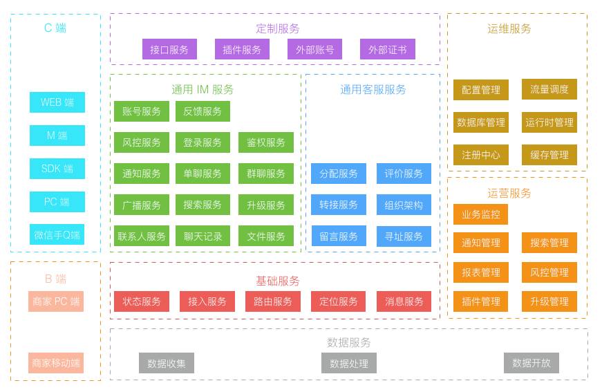 以前我们都是面向业务去架构系统,如今新的业务变化形势下我们开始考虑面向平台去架构,在统一平台上跑多套业务,统一源码,统一部署,统一维护。 把业务服务继续拆分,剥离出最基础的 IM 服务,IM 通用服务,客服通用服务,而针对不同的业务特殊需求做最小化的定制服务开发。 部署方式则以平台形式部署,不同的业务方的服务跑在同一个平台上,但数据互相隔离。 服务继续被拆分的更微粒化,形成了一组服务矩阵(见下图)。