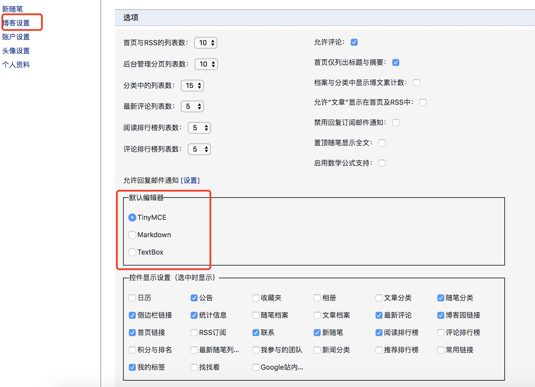 ### 设置代码块 1.找到选项  2.将默认编辑器设置为TinyMCE,点击保存  3.新创建随笔,可以选择不折叠