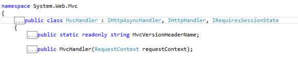 我们可以看到MvcHandler就是一个普通的Http Handler.我们知道一个http handler需要实现一个ProcessRequest()的方法,这个方法就是处理request的核心。所以MvcHandler实现了ProcessRequest()方法。
