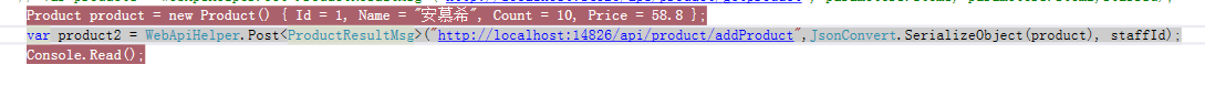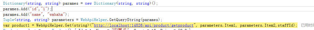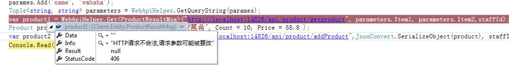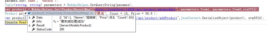 1.获取产品数据,传递参数id=1,name="wahaha" ,完整请求为http://localhost:14826/api/product/getproduct?id=1&name=wahaha