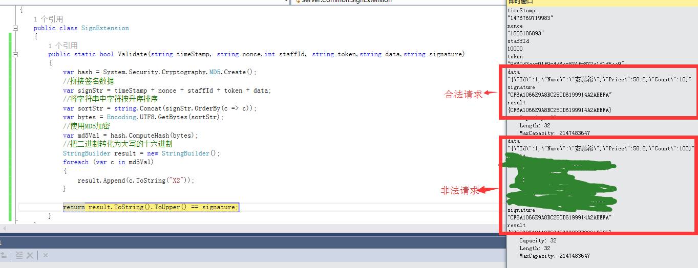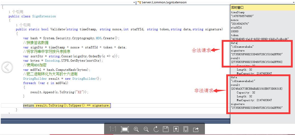 3.判断签名是否成功,第一次请求签名参数signature和服务器端计算result完全相同, 然后当把请求参数中count的数量从10改成100之后服务器端计算的result和请求签名参数signature不同,所以请求不合法,是非法请求,同理如果其他任何参数被修改最后计算的结果都会和签名参数不同,请求同样识别为不合法请求