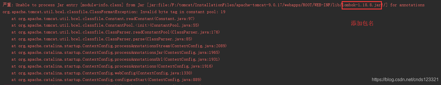 严重: Unable to process Jar entry [module-info.class] from Jar [jar:file:/F:/tomcat/InstallationFiles/apache-tomcat-9.0.17/webapps/ROOT/WEB-INF/lib/lombok-1.18.8.jar!/] for annotations