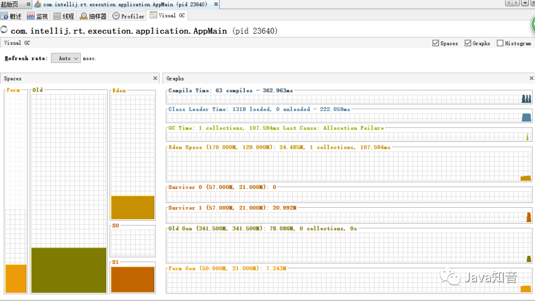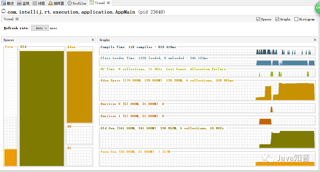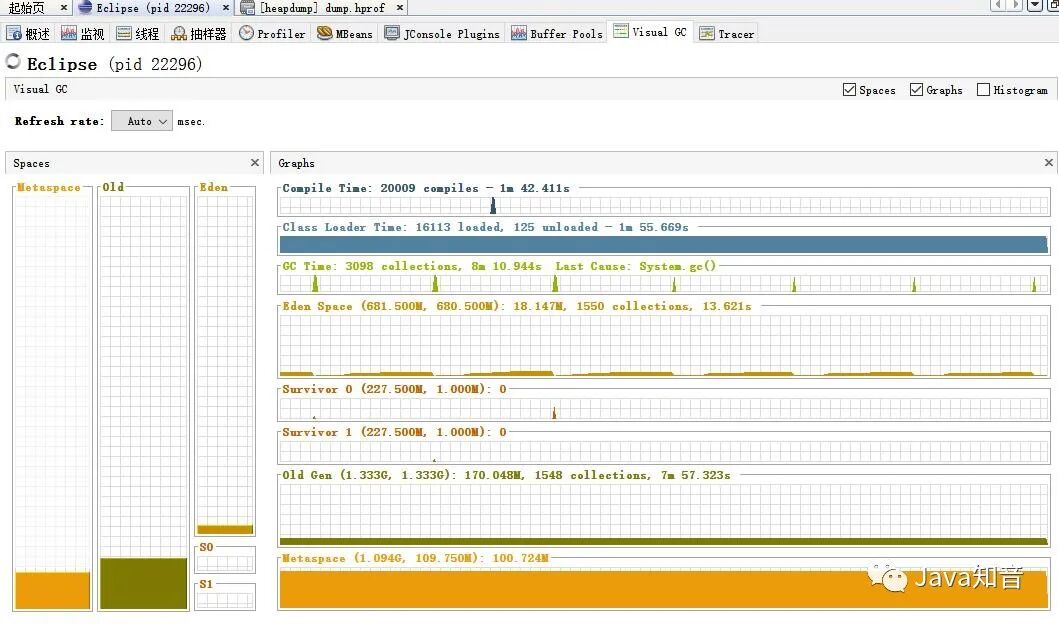 Visual GC 是常常使用的一个功能,可以明显的看到年轻代、老年代的内存变化,以及gc频率、gc的时间等。