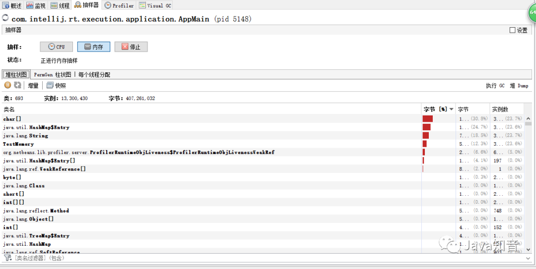 如何分析是那个对象泄漏了呢?打开抽样器标签:点击后如下图: