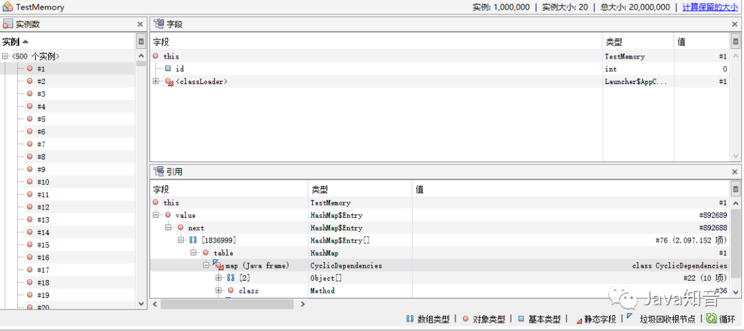 左侧是创建的实例总数,右侧上部为该实例的结构,下面为引用说明,从图中可以看出在类CyclicDependencies里面被引用了,并且被HashMap引用。