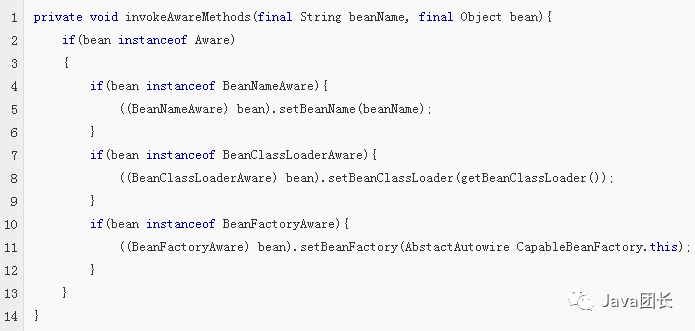 3.1 激活Aware方法:(invokeAwaresMethods)Spring中提供了一些Aware相关接口,比如BeanNameAware, BeanFactoryAware, ApplicationContextAware等,实现这些Aware接口的bean在被初始化之后,可以取得一些相对应的资源。
