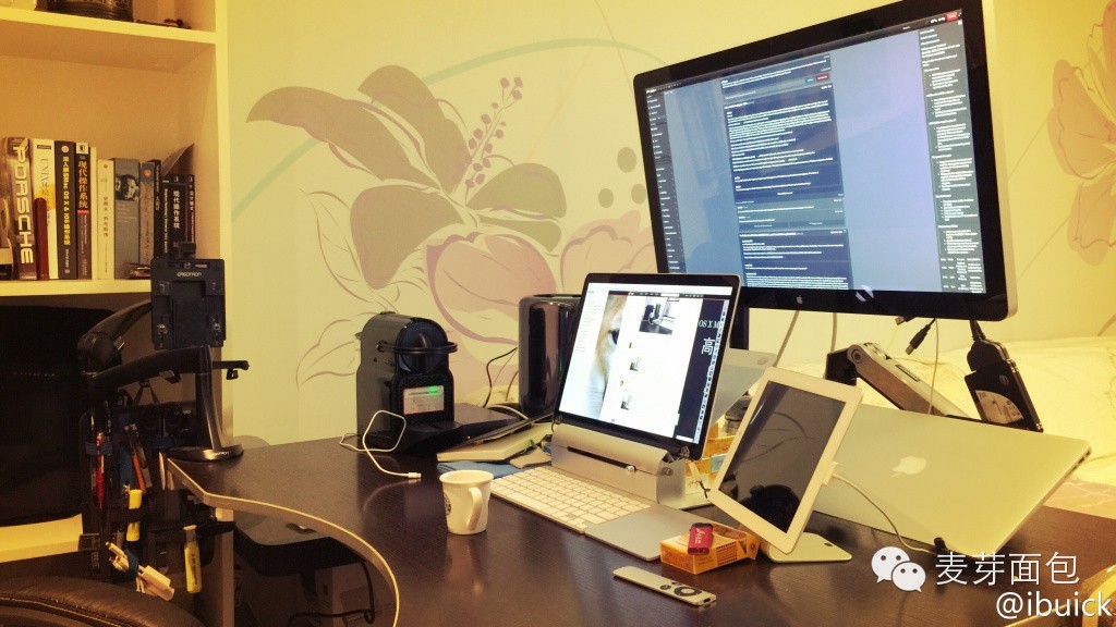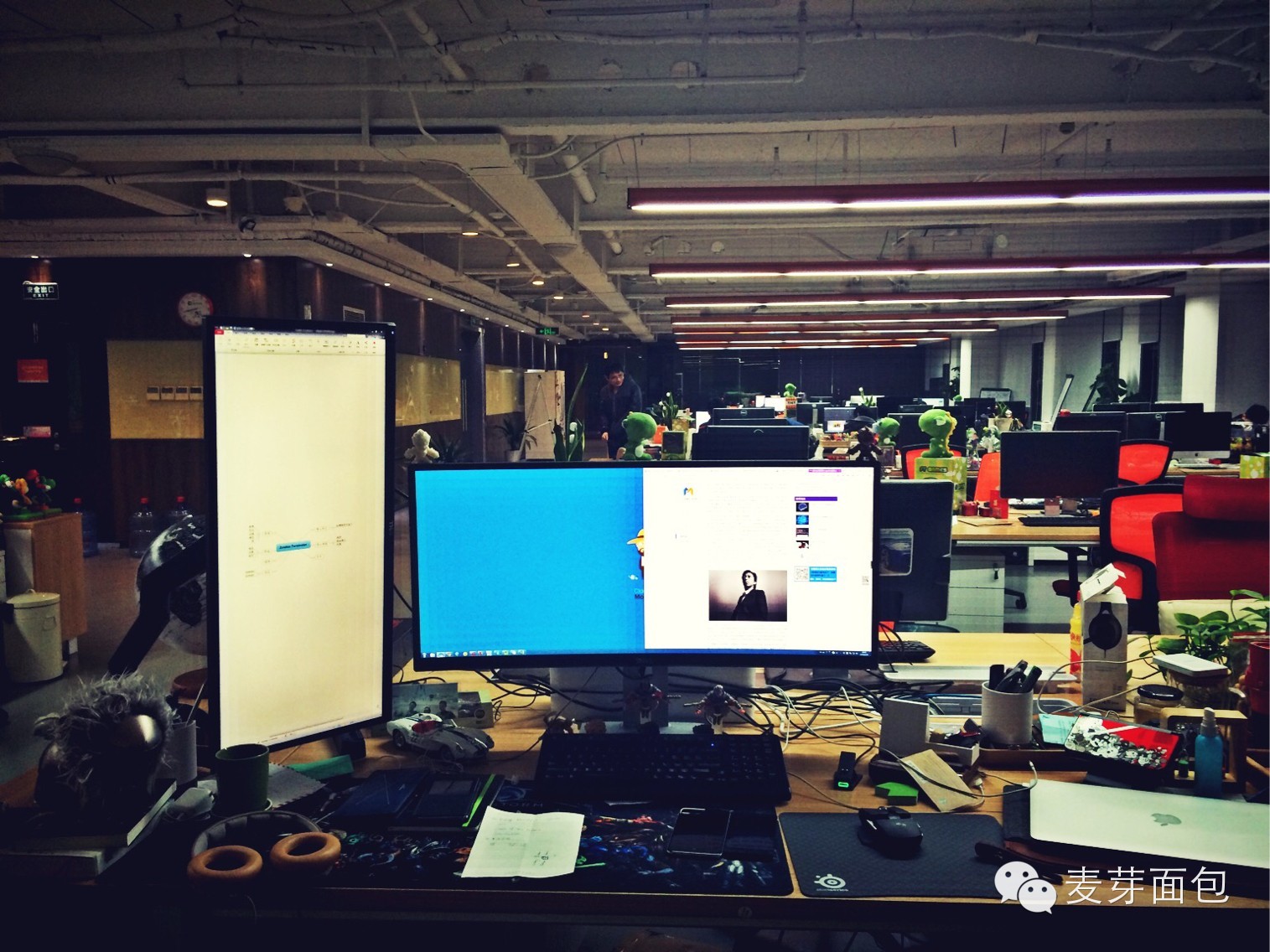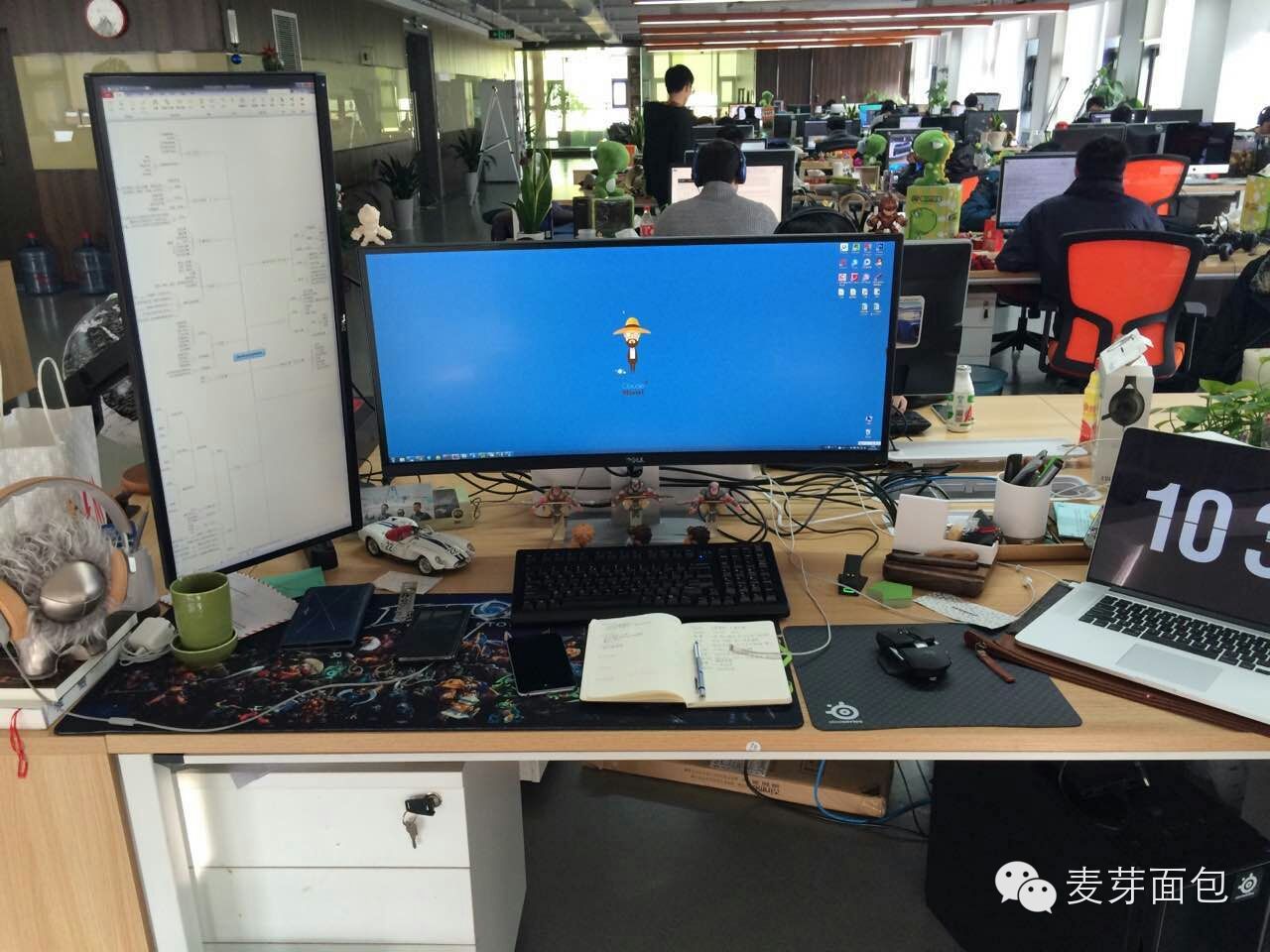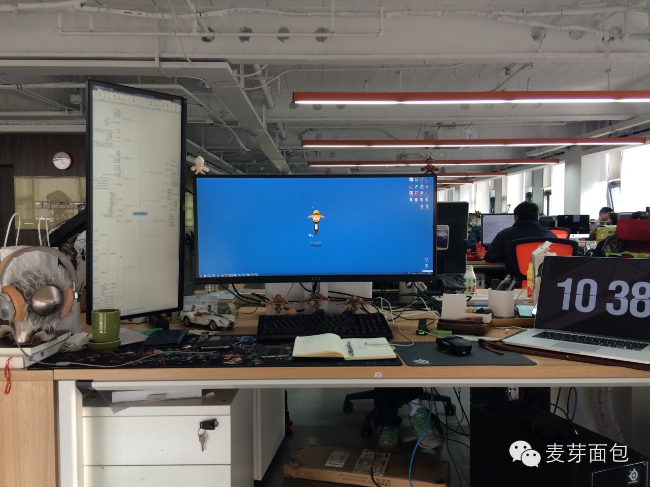 2.此图来自本人朋友,毕业没几年就进入手游行业创业,公司老板的桌面自然不同凡响,两个超宽屏提高效率,rmbp15当时钟