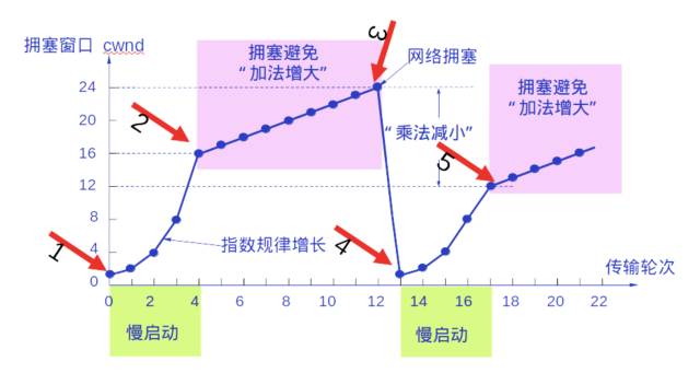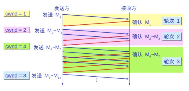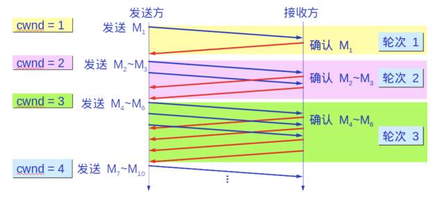 每经过一个传输轮次,拥塞窗口 cwnd 就加倍。一个传输轮次所经历的时间其实就是往返时间RTT。不过“传输轮次”更加强调:把拥塞窗口cwnd所允许发送的报文段都连续发送出去,并收到了对已发送的最后一个字节的确认。