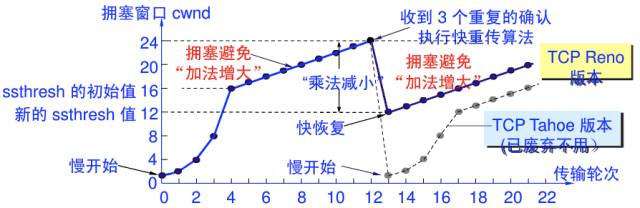 与快重传配合使用的还有快恢复算法,其过程有以下两个要点: