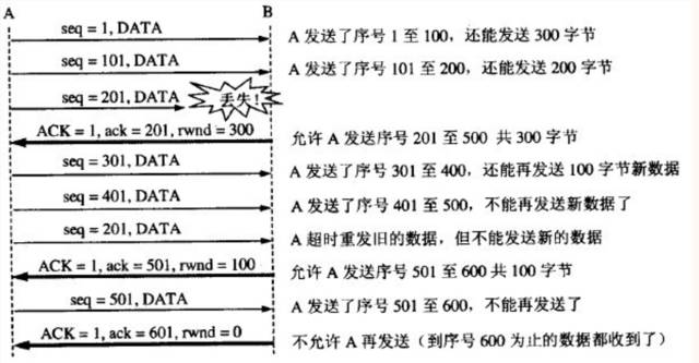 从图中可以看出,B进行了三次流量控制。第一次把窗口减少到 rwnd = 300 ,第二次又减到了 rwnd = 100 ,最后减到 rwnd = 0 ,即不允许发送方再发送数据了。这种使发送方暂停发送的状态将持续到主机B重新发出一个新的窗口值为止。B向A发送的三个报文段都设置了 ACK = 1 ,只有在ACK=1时确认号字段才有意义。