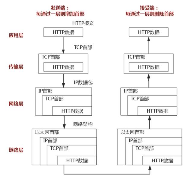 上图清楚地表示了TCP/IP协议中每个层的作用,而TCP/IP协议通信的过程其实就对应着数据入栈与出栈的过程。入栈的过程,数据发送方每层不断地封装首部与尾部,添加一些传输的信息,确保能传输到目的地。出栈的过程,数据接收方每层不断地拆除首部与尾部,得到最终传输的数据。