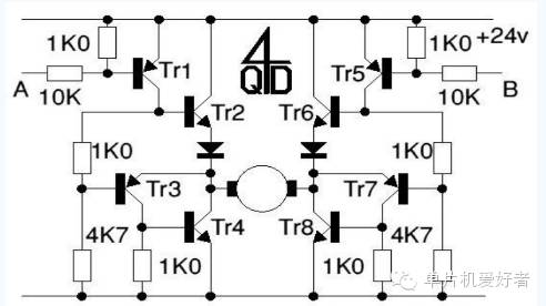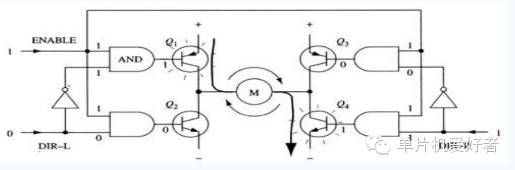 如图所示,H桥式电机驱动电路包括4个三极管和一个电机。要使电机运转,必须导通对角线上的一对三极管。根据不同三极管对的导通情况,电流可能会从左至右或从右至左流过电机,从而控制电机的转向。