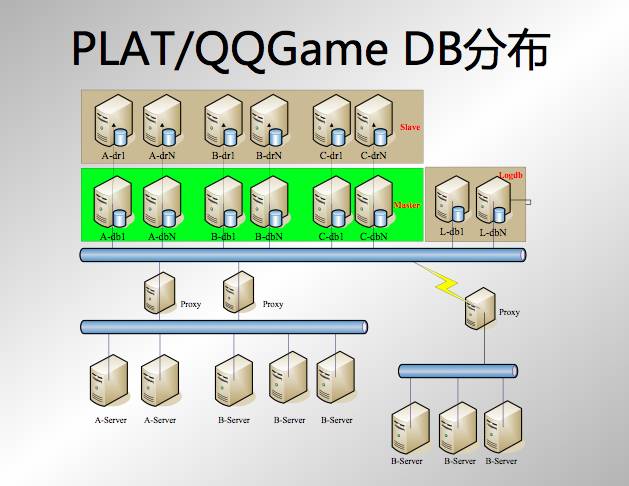 对于平台休闲/QQ游戏的DB,数据集中一个城市存放。因为游戏玩法相对最简单,所以,玩家自身的属性较少,可能就是积分、荣誉、装扮,少量道具的变化,对应数据量也比较小,比较适合集中存放,不同地域的gamesvr到专线也不会有太大压力。