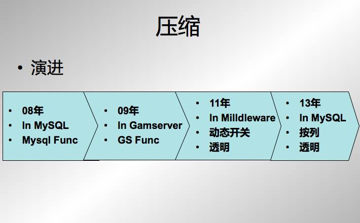 2013年,前面几种办法都不是DBA能完全cover的,总需要开发更新中间件,或者改写sql,或者更新gameserver逻辑,我们想了一招,就是把Mysql内完全解决这个问题,完全对开发透明,只要给字段通过alter增加Compress的属性,在MySQL底层直接就把大字段压缩给做了。这个效率,我们测试中发现远好于本身innodb page压缩。