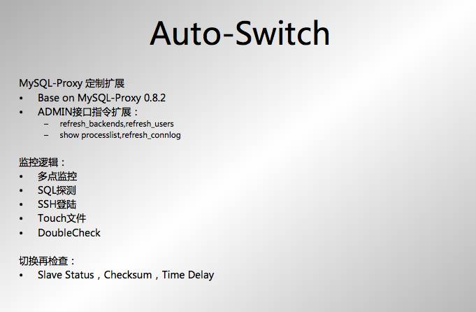 Auto-Switch首要的考虑是避免误切换。不切换影响最多回到从前,但误切换可能导致更加复杂的问题,比如切换到一个落后了几天数据的Slave,意味着要整体停机,数据乱了,耗费N个小时来做用户数据回档工作,新的用户数据完全丢失。