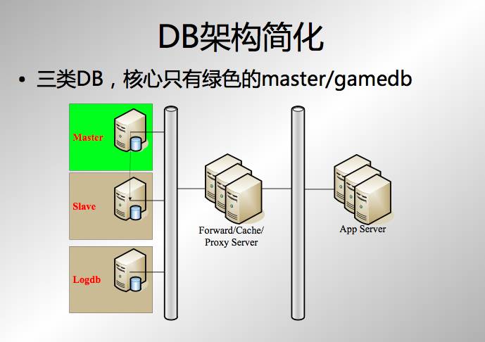 经过总结,发现其实架构是蛮简单的,我们的MySQL就很简单,一个Master,一个Slave,一个LogDB,把三种游戏精练一下,其实就是一个很简单的架构,如上图。